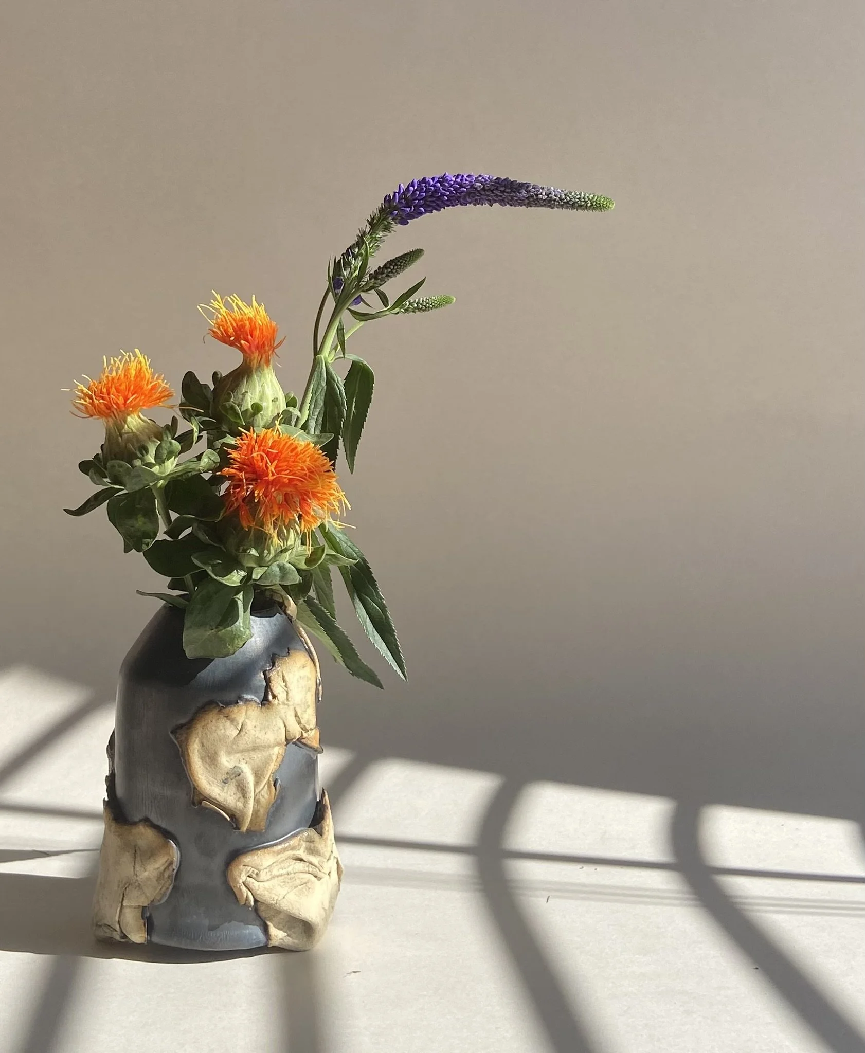 Through the merging of slab built construction with thrown forms, I depict the internal turmoil that I experienced while attempting to seem like everybody else. The distressed slabs encasing the thrown form and completing the silhouette of the vessel represent the way in which the environment of my upbringing shaped the way I presented myself. The hand built components are left unglazed to not gloss over the pain of those hardships, to not erase the grit of my experience. The body of the vessel is thrown and glazed in a dark color palette to portray the truth of my emotions suppressed within. My vessels as a whole show the struggle of trying to fit within the perimeters of what is socially accepted.